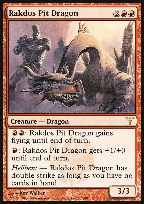 {R}{R}: Rakdos Pit Dragon gains flying until end of turn. {R}: Rakdos Pit Dragon gets +1/+0 until end of turn. Hellbent — Rakdos Pit Dragon has double strike as long as you have no cards in hand.