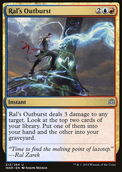 Ral's Outburst deals 3 damage to any target. Look at the top two cards of your library. Put one of them into your hand and the other into your graveyard.