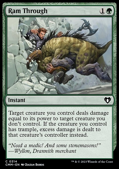 Target creature you control deals damage equal to its power to target creature you don't control. If the creature you control has trample, excess damage is dealt to that creature's controller instead.