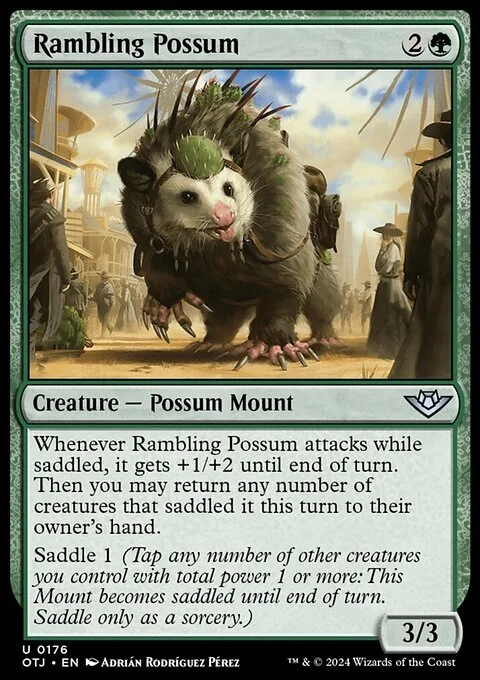 Whenever Rambling Possum attacks while saddled, it gets +1/+2 until end of turn. Then you may return any number of creatures that saddled it this turn to their owner's hand. Saddle 1 (Tap any number of other creatures you control with total power 1 or more: This Mount becomes saddled until end of turn. Saddle only as a sorcery.)