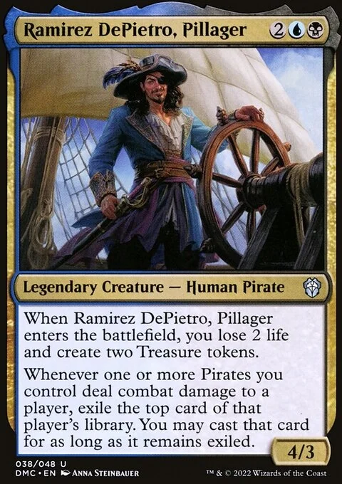 When Ramirez DePietro, Pillager enters, you lose 2 life and create two Treasure tokens.