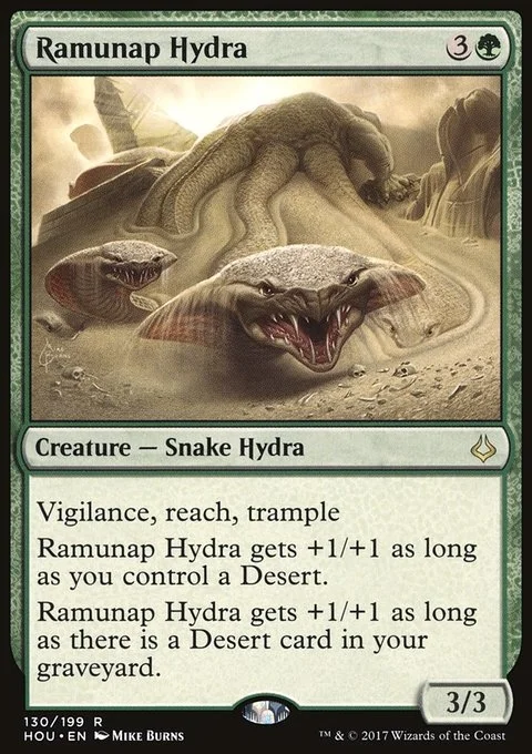 Vigilance, reach, trample Ramunap Hydra gets +1/+1 as long as you control a Desert. Ramunap Hydra gets +1/+1 as long as there is a Desert card in your graveyard.