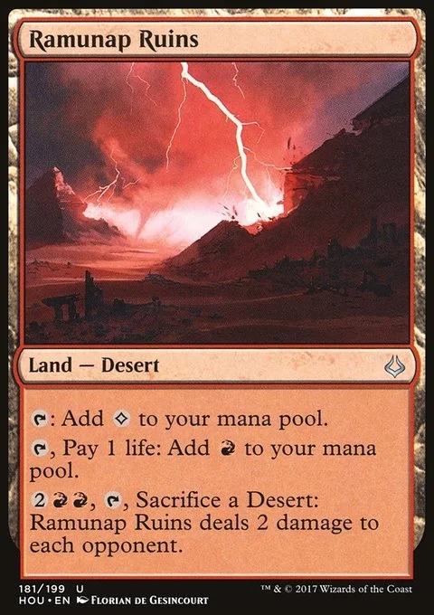 {T}: Add {C}. {T}, Pay 1 life: Add {R}. {2}{R}{R}, {T}, Sacrifice a Desert: Ramunap Ruins deals 2 damage to each opponent.