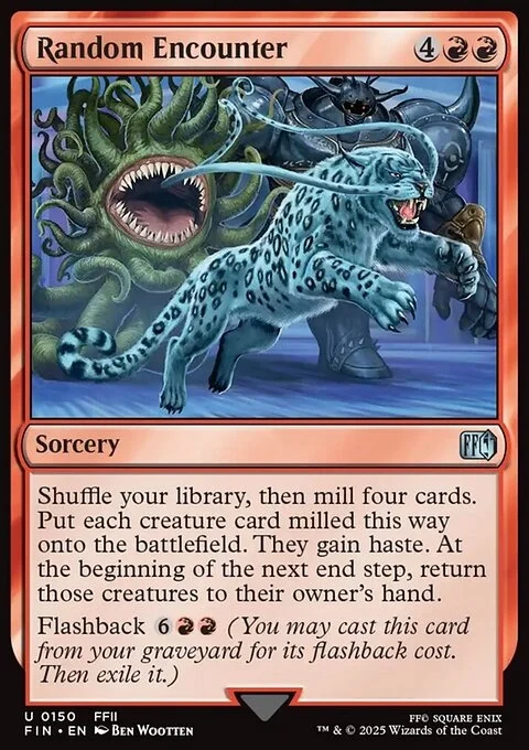 Shuffle your library, then mill four cards. Put each creature card milled this way onto the battlefield. They gain haste. At the beginning of the next end step, return those creatures to their owner's hand.
