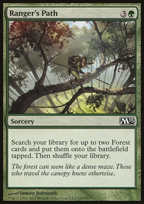 Search your library for up to two Forest cards and put them onto the battlefield tapped. Then shuffle your library.