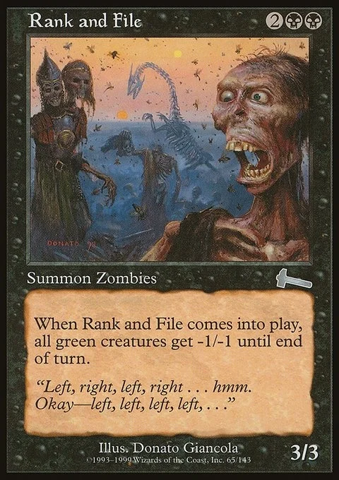 When Rank and File comes into play, all green creatures get -1/-1 until end of turn.