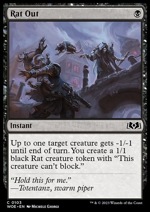 Up to one target creature gets -1/-1 until end of turn. You create a 1/1 black Rat creature token with "This token can't block."