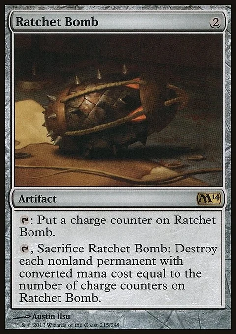 {T}: Put a charge counter on Ratchet Bomb. {T}, Sacrifice Ratchet Bomb: Destroy each nonland permanent with converted mana cost equal to the number of charge counters on Ratchet Bomb.