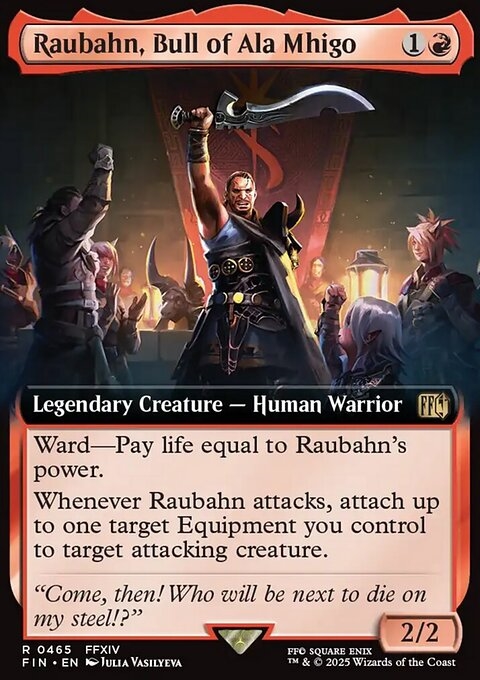 Ward—Pay life equal to Raubahn's power. Whenever Raubahn attacks, attach up to one target Equipment you control to target attacking creature.