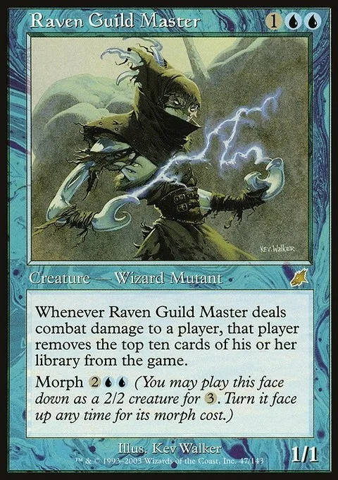 Whenever Raven Guildmaster deals combat damage to a player, that player removes the top ten cards of his or her library from the game.