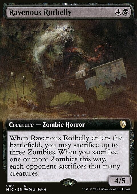 When this creature enters, you may sacrifice up to three Zombies. When you sacrifice one or more Zombies this way, each opponent sacrifices that many creatures of their choice.