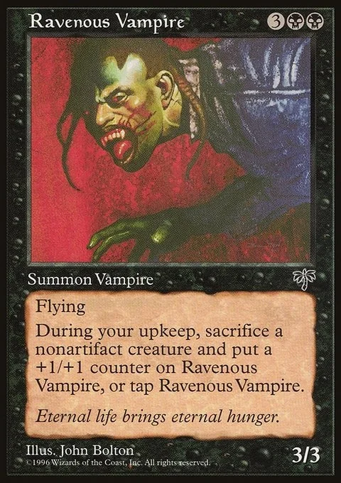 FlyingDuring your upkeep, sacrifice a nonartifact creature and put a +1/+1 counter on Ravenous Vampire, or tap Ravenous Vampire.