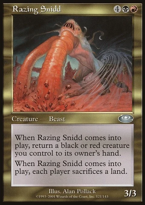 When Razing Snidd enters the battlefield, return a black or red creature you control to its owner's hand. When Razing Snidd enters the battlefield, each player sacrifices a land.