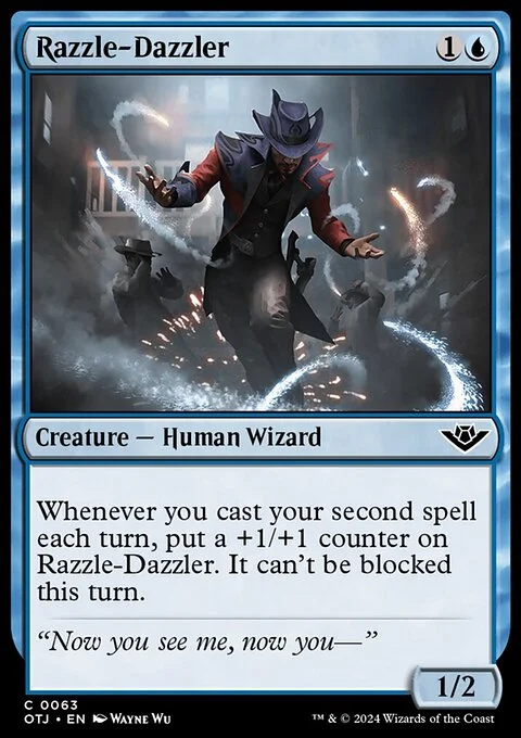 Whenever you cast your second spell each turn, put a +1/+1 counter on this creature. It can't be blocked this turn.