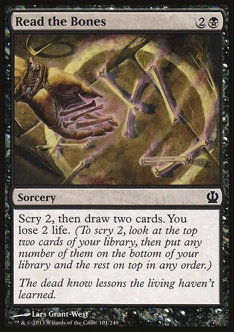 Scry 2, then draw two cards. You lose 2 life. (To scry 2, look at the top two cards of your library, then put any number of them on the bottom of your library and the rest on top in any order.)