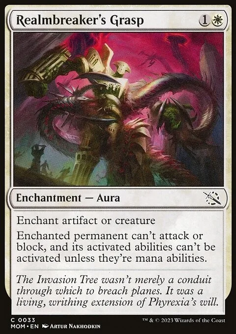 Enchant artifact or creature Enchanted permanent can't attack or block, and its activated abilities can't be activated unless they're mana abilities.