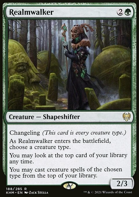 Changeling (This card is every creature type.) As Realmwalker enters, choose a creature type. You may look at the top card of your library any time. You may cast creature spells of the chosen type from the top of your library.