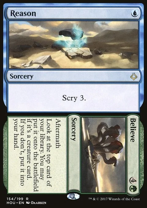 Reason Scry 3. Believe Aftermath (Cast this spell only from your graveyard. Then exile it.) Look at the top card of your library. You may put it onto the battlefield if it's a creature card. If you don't, put it into your hand.