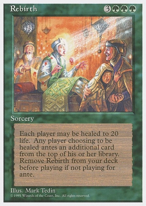 Each player may be healed to 20 life. Any player choosing to be healed antes an additional card from the top of his or her library. Remove Rebirth from your deck before playing if not playing for ante.