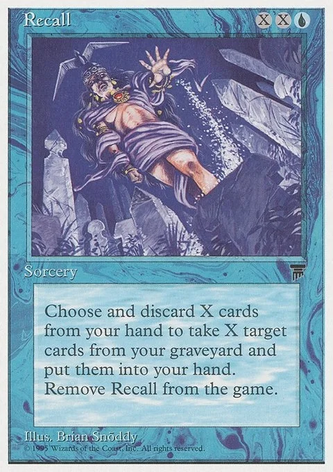 Choose and discard X cards from your hand to take X target cards from your graveyard and put them into your hand. Remove Recall from the game.