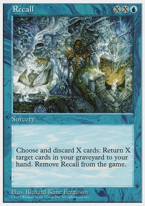 Choose and discard X cards: Return X target cards in your graveyard to your hand. Remove Recall from the game.
