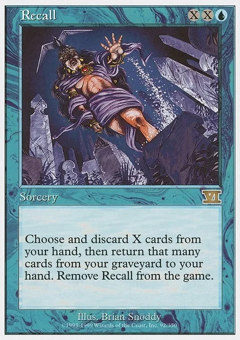 Choose and discard X cards from your hand, then return that many cards from your graveyard to your hand. Remove Recall from the game.