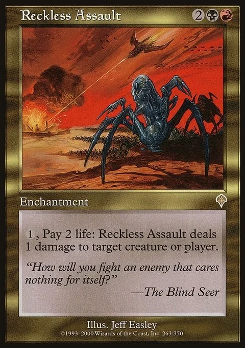 1, Pay 2 life: Reckless Assault deals 1 damage to target creature or player.