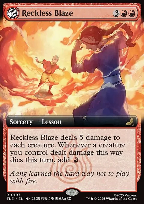 Reckless Blaze deals 5 damage to each creature. Whenever a creature you control dealt damage this way dies this turn, add {R}.