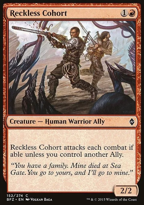 Reckless Cohort attacks each combat if able unless you control another Ally.