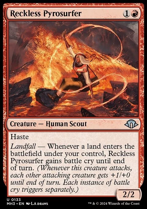 Landfall — Whenever a land enters the battlefield under your control, Reckless Pyrosurfer gains battle cry until end of turn. (Whenever this creature attacks, each other attacking creature gets +1/+0 until end of turn. Each instance of battle cry triggers separately.)