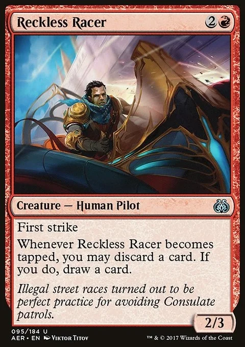 First strike Whenever Reckless Racer becomes tapped, you may discard a card. If you do, draw a card.