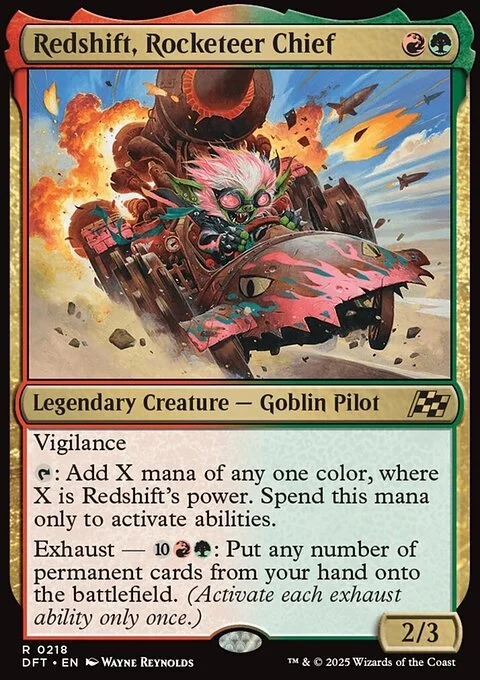 Vigilance {T}: Add X mana of any one color, where X is Redshift's power. Spend this mana only to activate abilities. Exhaust — {10}{R}{G}: Put any number of permanent cards from your hand onto the battlefield. (Activate each exhaust ability only once.)