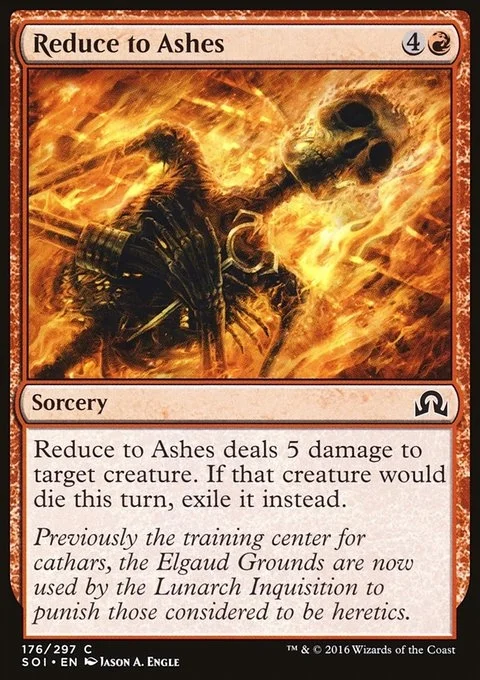 Reduce to Ashes deals 5 damage to target creature. If that creature would die this turn, exile it instead.