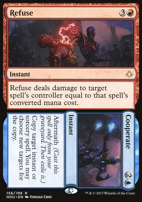 Refuse Refuse deals damage to target spell's controller equal to that spell's mana value. Cooperate Aftermath (Cast this spell only from your graveyard. Then exile it.) Copy target instant or sorcery spell. You may choose new targets for the copy.