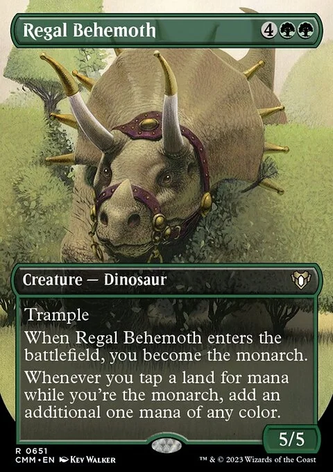 Trample When this creature enters, you become the monarch. Whenever you tap a land for mana while you're the monarch, add an additional one mana of any color.