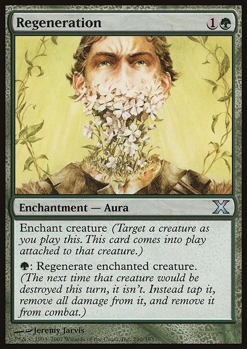 {G}: Regenerate enchanted creature. (The next time that creature would be destroyed this turn, it isn't. Instead tap it, remove all damage from it, and remove it from combat.)