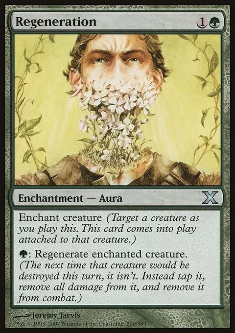 Enchant creature (Target a creature as you cast this. This card enters the battlefield attached to that creature.) {G}: Regenerate enchanted creature. (The next time that creature would be destroyed this turn, it isn't. Instead tap it, remove all damage from it, and remove it from combat.)