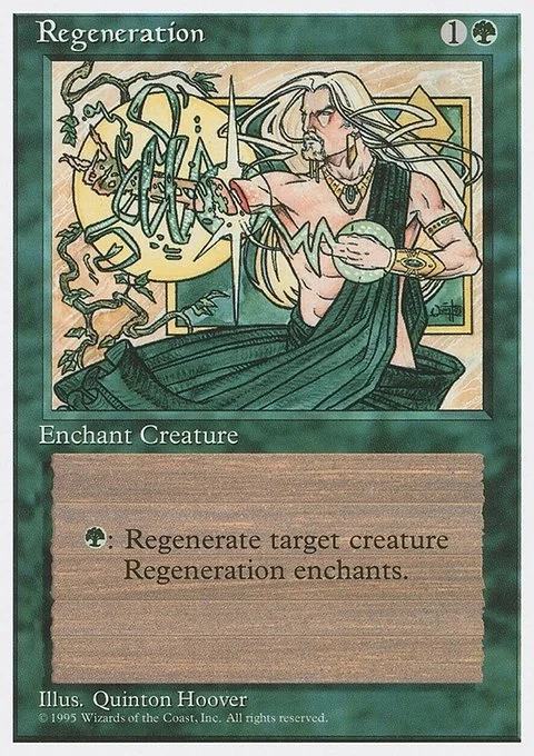 Enchant creature (Target a creature as you cast this. This card enters the battlefield attached to that creature.) {G}: Regenerate enchanted creature. (The next time that creature would be destroyed this turn, it isn't. Instead tap it, remove all damage from it, and remove it from combat.)