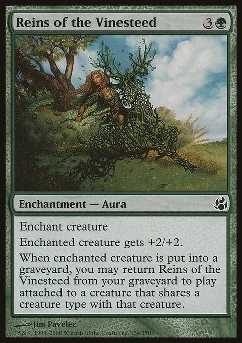 Enchant creature Enchanted creature gets +2/+2. When enchanted creature dies, you may return Reins of the Vinesteed from your graveyard to the battlefield attached to a creature that shares a creature type with that creature.