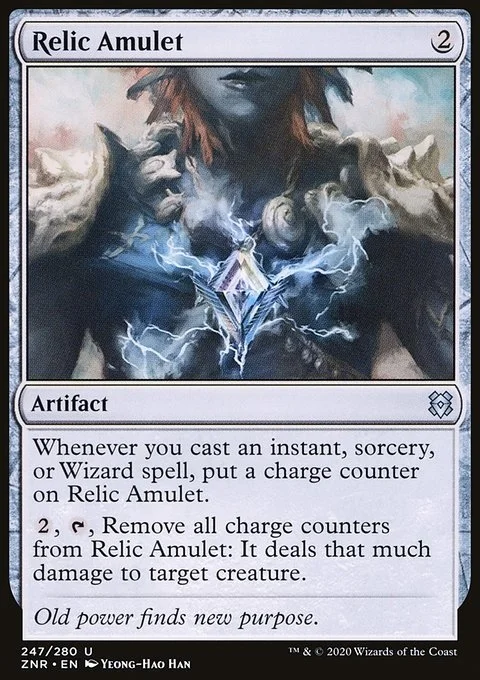 Whenever you cast an instant, sorcery, or Wizard spell, put a charge counter on Relic Amulet. {2}, {T}, Remove all charge counters from Relic Amulet: It deals that much damage to target creature.
