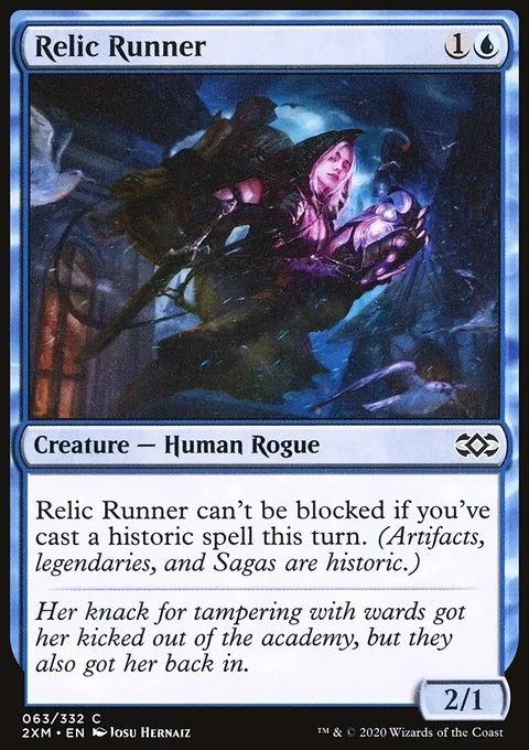 Relic Runner can't be blocked if you've cast a historic spell this turn. (Artifacts, legendaries, and Sagas are historic.)