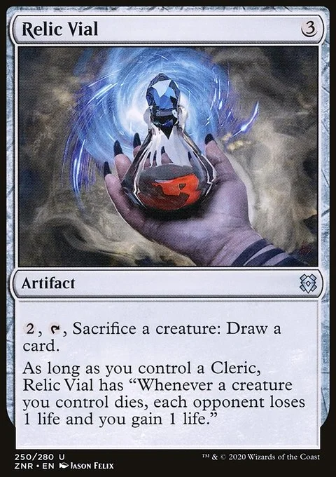 {2}, {T}, Sacrifice a creature: Draw a card. As long as you control a Cleric, Relic Vial has "Whenever a creature you control dies, each opponent loses 1 life and you gain 1 life."