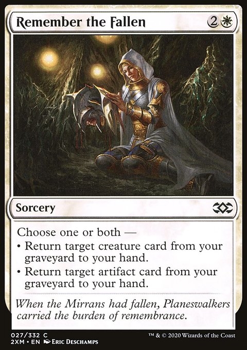 Choose one or both — • Return target creature card from your graveyard to your hand. • Return target artifact card from your graveyard to your hand.