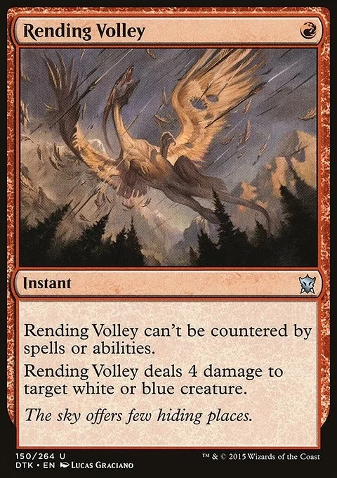 This spell can't be countered. Rending Volley deals 4 damage to target white or blue creature.