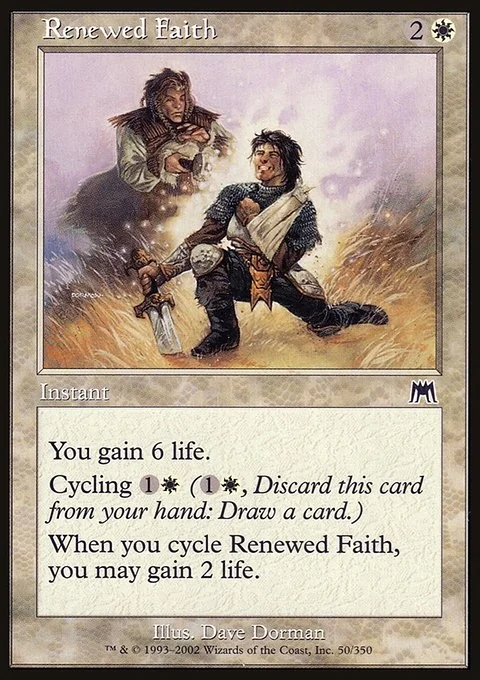 You gain 6 life. Cycling {1}{W} ({1}{W}, Discard this card: Draw a card.) When you cycle Renewed Faith, you may gain 2 life.
