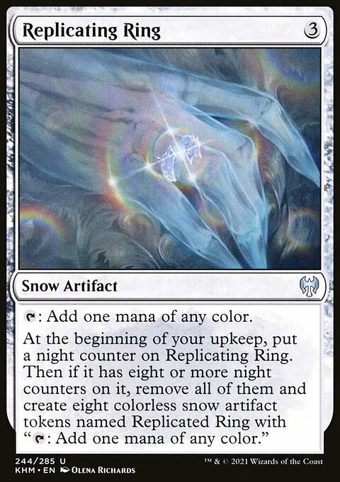 At the beginning of your upkeep, put a night counter on Replicating Ring. Then if it has eight or more night counters on it, remove all of them and create eight colorless snow artifact tokens named Replicated Ring with "{T}: Add one mana of any color."