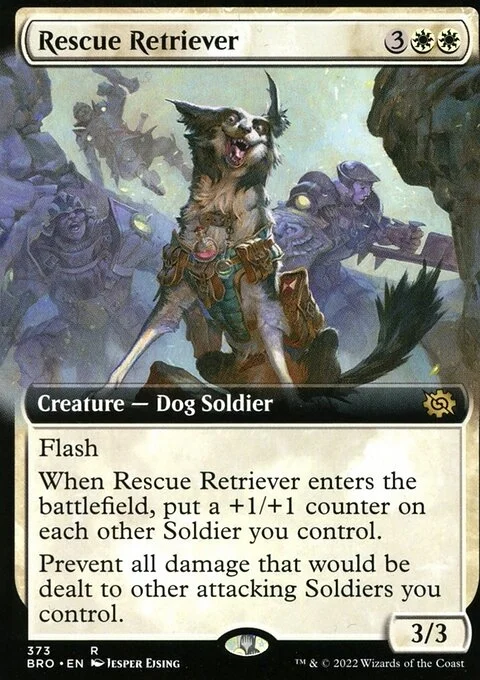 Flash When this creature enters, put a +1/+1 counter on each other Soldier you control. Prevent all damage that would be dealt to other attacking Soldiers you control.