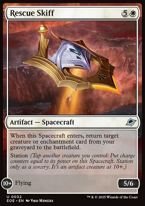 When this Spacecraft enters, return target creature or enchantment card from your graveyard to the battlefield. Station (Tap another creature you control: Put charge counters equal to its power on this Spacecraft. Station only as a sorcery. It's an artifact creature at 10+.) STATION 10+ Flying