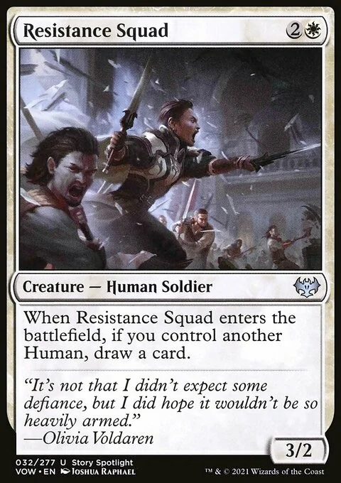 When Resistance Squad enters the battlefield, if you control another Human, draw a card.