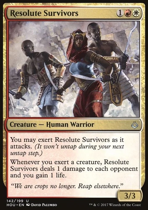 You may exert Resolute Survivors as it attacks. (It won't untap during your next untap step.) Whenever you exert a creature, Resolute Survivors deals 1 damage to each opponent and you gain 1 life.